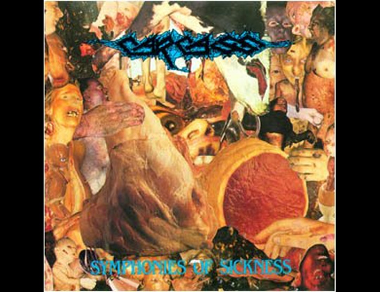 Carcass - Symphonies of Sickness - Not the grossest of all those lame-ass goregrind album's out there. Not by any means; but if you look at this for a moment or study it for a while (without gagging), you will always say - gross. (Cannibal Corpse was just too obvious to mention - oh wait, I just mentioned them.)